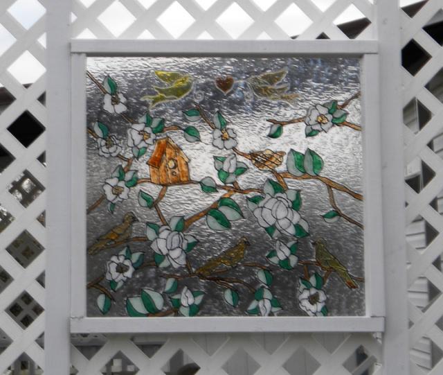 That radiating piece of glass can be bought in many shapes and sizes, from the beautiful to the inexpensive looks nice. The only problem is that the design you want is never on the shelf, and unless you can pay for a specialized piece you will never get that perfect one. Stained glass is beautiful, but impractical for a person of mediocre art abilities to create. Stained Glass Paint, in easy applicator bottles are made by a couple of different manufactures and is very affordable for creative people of all ages.