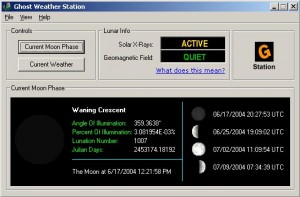 There is an awesome freeware program I use, called Ghost Weather Station, which easily and effectively collects a lot of this data for quick recording while on site; by Jonathan Moore, it is available for download at wvghosts.com– so don’t get tricked by sites that ask for payment! This tiny program provides (with a working internet connection) the current lunar and weather conditions including the Moon phases. It will present Moon angle, percent of lumination, Julian Days, and lunation number; as well as the current Solar X-Ray and Geomagnetic Field status of the area after inputting the zip code.