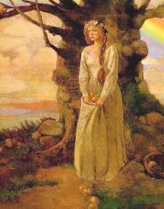 Idun, “She who renews”, is known as the goddess of spring, eternal youth, health and life. It is said that she had no birth and is destined to never know death. At times she is known as a fair maiden, soft and delicate, and at others, sturdy and hard working. She is charged with tending the sacred orchard from which all fruits stem, blessing health and longevity for all who partake.