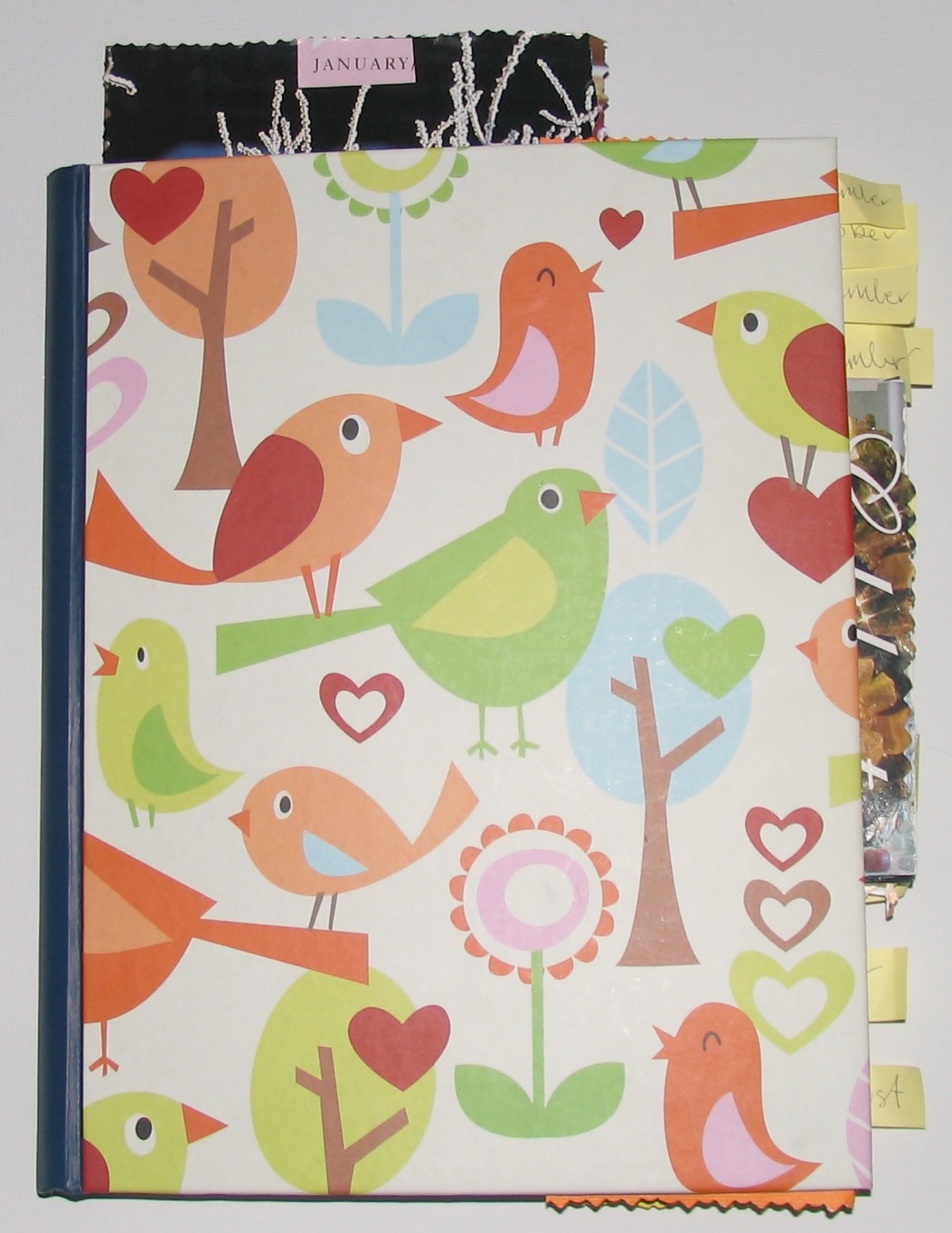 If using a large journal, separate the pages into 12 equal sections. I began by separating mine into four seasons. I collaged the first page of these sections to indicate the season. Then I used sticky note tabs for each month. My intention this year is to make a bookmark for each month as I go along.