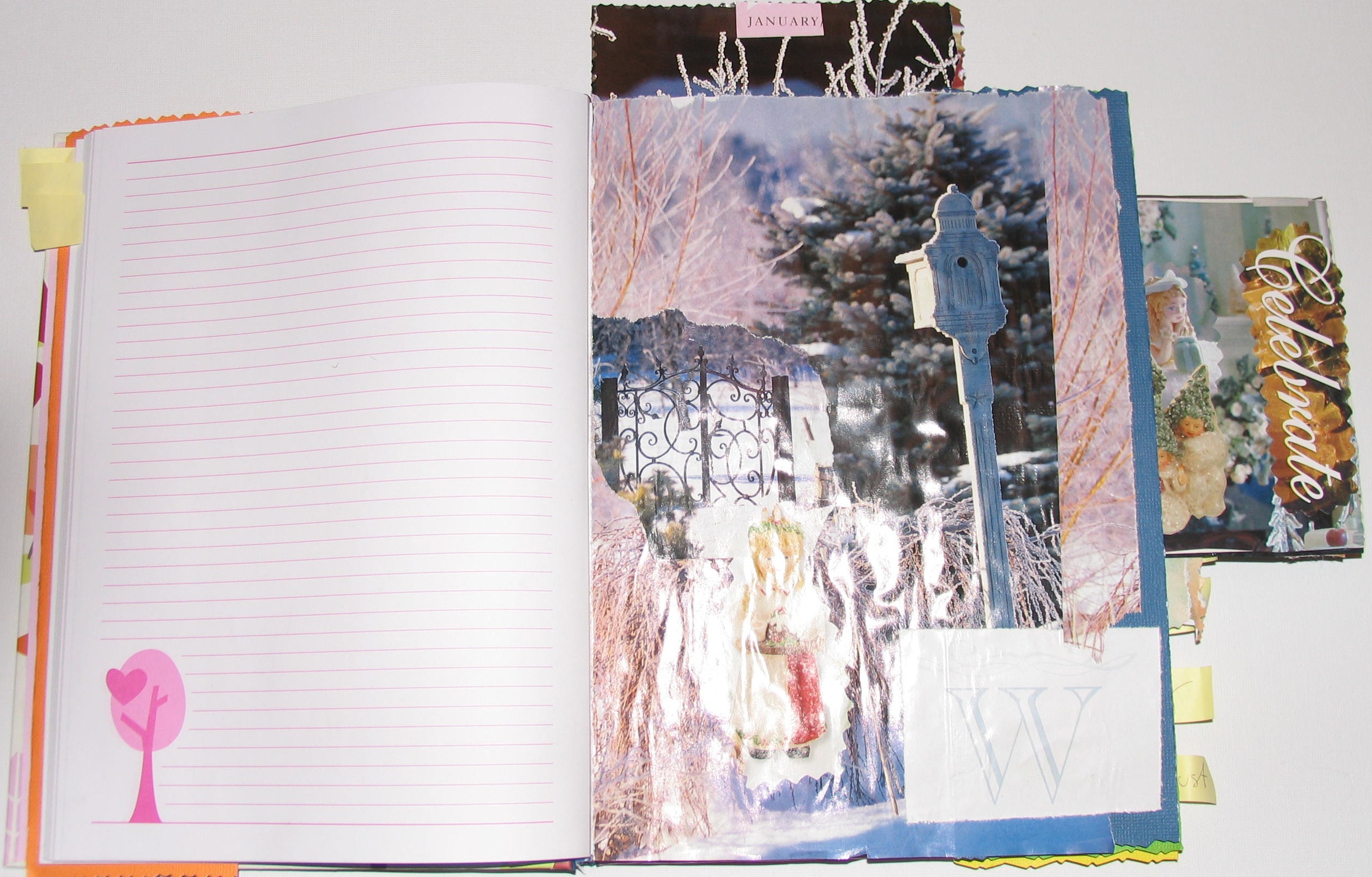 I keep my Book of Seasons in a basket with my favorite pen, a gluestick, magazines, catalogs and beautiful cards I receive. I follow my heart and write a daily affirmation for myself. I list all that I wish to place into a vision of a pink bubble as a tool of intention. Doodles or mini collages grace most pages.