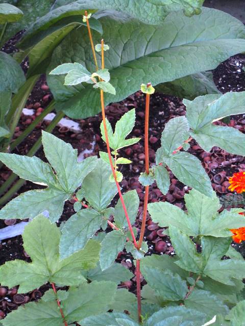 As I was finishing up the replanting, I had several small pots with unidentified plants (I am not always consistent with labeling my pots-a bad practice). As I was placing the unknown entities into the compost, there was one that at the very last moment caused me to stop. Hmmm…this did not look like a weed; its leaf pattern and stem color were too unusual. Then I remembered that over a year ago, I planted some Meadowsweet seed in a little pot, but the only thing that grew was Chickweed, so I put the pot aside. Over one year later, here was a little Meadowsweet plant making her entry into the world. Excitedly, I planted her in the new garden, thinking she probably would not get very large until next year. WRONG! She grew quickly into a very lovely plant, living up to her other name, Queen of the Meadow. I remembered reading that some seeds can take up to several years before they will germinate- another lesson in patience this year.