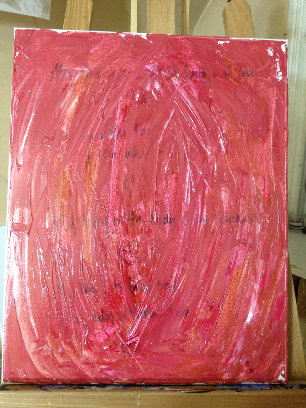 The first layer of paint is the core essence of the intent laid on in thick paint and just a few colors. Here, bold pinks, reds, and oranges are put down with a palette knife in a simplified vulva shape.