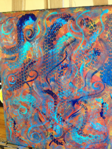 Throughout the process, I’m talking to the spirit coming through the canvas. I’m dancing for the spirit. I’m breathing on the canvas. I’m praying over the canvas. Sometimes I will anoint the canvas with oils or I’ll smudge it with incense or sage. If the image is of a particular spirit or deity, then I am developing a relationship with that being and creating a portal through which they can for them to communicate with this world. Throughout, I am listening to and guided by the spirit. Painting for me is about placing myself in the hands of Mystery and trusting that, through the journey, we will create something powerful together.