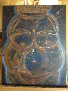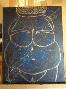 The final layer is the image that people will see. For this piece, I used the Goddess of Willendorf, an image of the great mother that I have always had issues with. I didn’t choose this image specifically — it was part of a class assignment. But I took the image and confronted my body issues with it head on. I wanted that fat body writ large and “in your face,” not ashamed, just big and bold and taking up the whole f@&$ing canvas. All the things I wanted to hide about my body, there was no hiding in this canvas. This Goddess COMMANDED the whole galaxy, and thus the whole canvas.