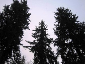 Following the Gathering, I could not get the song we sang that morning out of my head and realized how devoid of spirituality my daily routine had become. My morning ‘ritual’ consisted of hitting the snooze button on the alarm several times before racing out of bed in time to catch the bus to work before it left the transit mall. As I was mulling all this over early one Sunday morning while staring out the patio door, I glimpsed the three magnificent Douglas Firs that tower over our back yard from the adjacent property. They have always reminded me of sisters huddled together in gossipy conversation and over the years I began referring to them as The Three Sisters.