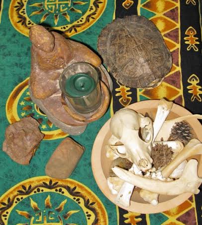 Some of the items typically found on an altar are a covering, one or more candles in holders of some sort, salt, water, incense and something to burn it in, a libation dish or bowl, items that represent the elements, and something representing one or more deities.