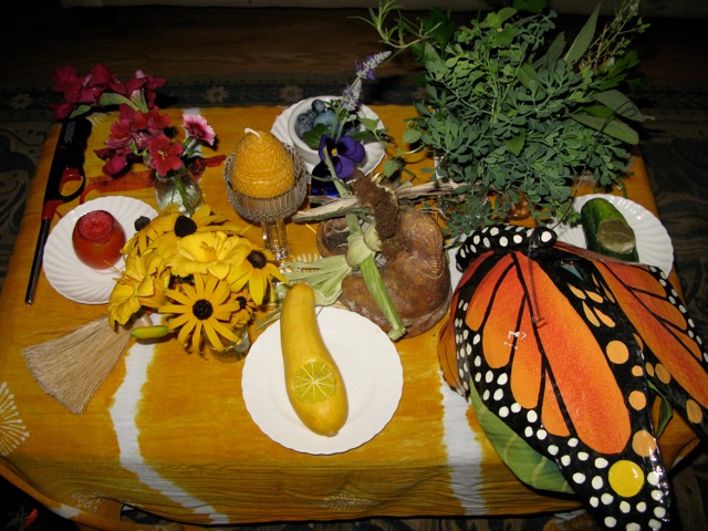 To mark Lughnasadh, I typically set up an altar with the bounty from my garden and from nature. Sometimes that altar has been set in nature and left for those who call the area home. Arranging items is done as an expression of gratitude, of giving back to the universe for all it has given me. Sitting before it, I count my blessings, recognizing all that I have received, all that I am thankful for, and all that has come my way. I end by eating some of the seasonal bounty I’ve set aside for that purpose, often making corn pone or corn muffins with my grain of choice, along with munching on cherry tomatoes or blueberries (first offering some to the ground for the deities and fairies). Popcorn also works well. While I like a summer ale at Lughnasadh, mead is always good, as are seasonal beverages such as blueberry, cherry and tomato juice; or lemonade (again, offering some to the ground for the deities and the fairies).
