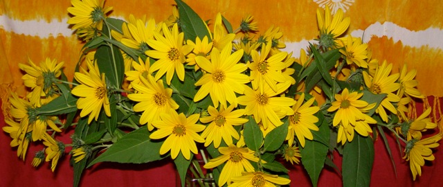The flowers of the Jerusalem artichoke that grows wild in no man’s land at the back of the community garden have decorated my Mabon altar for free every year since I first found them. For me, they have come to symbolize the last warmth from the sun before it begins its journey into the dark half of the year.