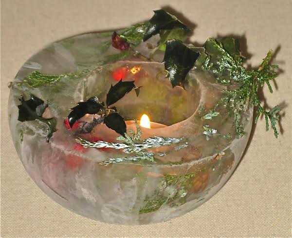 To make the ones in the photograph, I put a bit of water in the bottom of the larger container and let it freeze until firm. Then I placed the smaller container in the middle, arranged seasonal items between the two and poured in a bit more water. It went back in the freezer until almost completely frozen. I removed it again and filled the remainder of the container and let it freeze, but not to the point of being frozen solid.