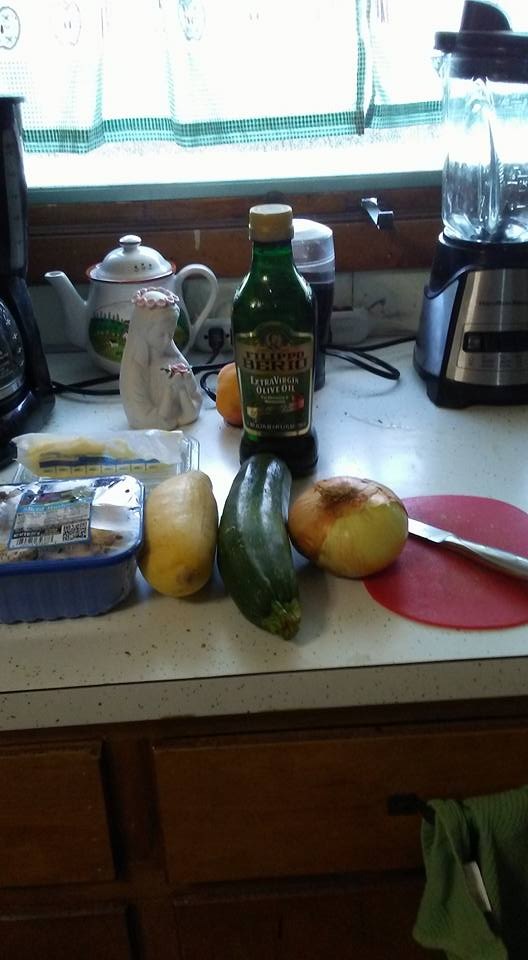 You start by melting some butter in a pan – or heating some olive oil – whatever your preference is – I use a mixture of the two. While this is happening, slice your zucchini. I generally use a mixture of zucchini and summer squash, because I like the look of green and yellow in the pan. Slice your onions and if your mushrooms need slicing, do them as well.
