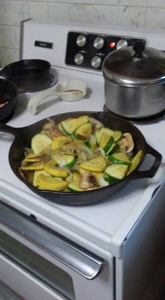 One of my favorite ways to use zucchini is to saute it with onions and mushrooms. This is a recipe I got from my mother. Of course – like so many of her recipes – it’s not actually a recipe at all – it’s just something that she did. I learned how to make this simply by watching her do it.