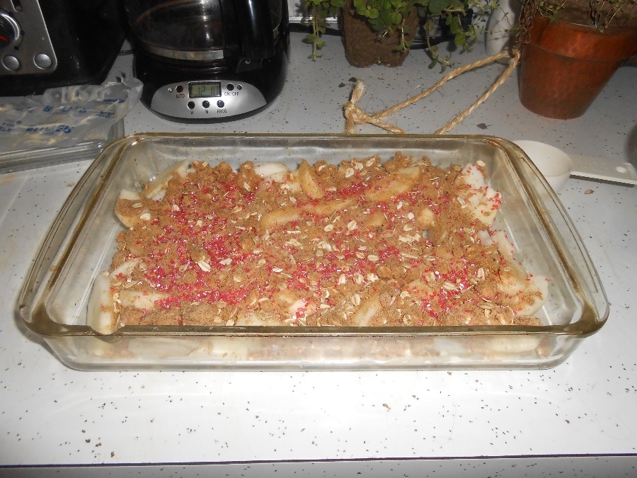 I put red sugar sprinkles on the top of the sugar-flour mixture before baking and as you can see, it made the apple crisp look really festive! And of course – you have to have ice cream for a topping! I topped my serving with maple walnut ice cream – it was divine!