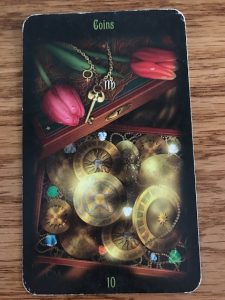 The Ten of Coins from the Gateway to the Divine Tarot offers a different image; it shows a treasure box filled with Coins and gems and chains made from precious metals. On the lid of the box rests a pair of tulips, and the golden key that unlocked and opened the box. This Ten symbolizes the fullness and completeness of a manifestation process that happens via long-term and non-liquid investments. The image implies wealth and security, the value of family heirlooms, and the importance of community, friends, family, family legacy, and the focus necessary to see a process to its successful conclusion. The treasure chest is shown unlocked and open, telling us these resources are accessible and available. Reversed, this Ten of Coins tells of a conflict of loyalties, insecurity, loss, slothfulness and dullness.