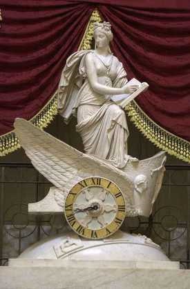 And, finally, a more modern testament to the lasting influence of the Muse of History and the need for the recording of its facts is the representation of Clio found in the National Statuary Hall of the capital building in Washington, DC. Gracing the doorway into this illustrious hall that served as meeting place for the decisive and historical actions of the House of Representatives from 1807 to 1857 is the Car of History designed by sculptor Carlo Franzoni in 1819. Clio stands within a winged chariot that serves as the vehicle and personification that represents the passing of history through the ages. In place of the ancient scroll, she holds her book of remembrance and records the events of history as they unfold. The chariot has a singular wheel that is a clock representing the passage of time in the hours and minutes of the days. The Chariot sits atop a marble globe which has the signs of the Zodiac on it completing the reference to the eternal and cyclical nature of time, events and the never ending history that is created by its turning.