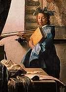 “ The artist observes his model, who is dressed as Clio, the muse of history. As he records her image carefully on his canvas, he is not so much the recipient of the muse’s inspiration as the agent through whom she takes on life and significance. Clio wears a crown of laurel on her head to denote honor, glory, and eternal life. In one hand she holds a trumpet, which stands for fame, and in the other she clasps a thick folio, perhaps a volume of Thucydides, which symbolizes history. These were the attributes ascribed to her by Cesare Ripa in his Iconologia, a sixteenth-century book of emblems and personifications that was widely used by artists.” 2.