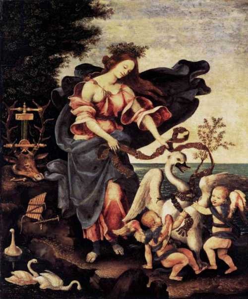 During the Age of the Renaissance we see Erato’s influence strongly present in the ballads of the troubadours, the bards, artists and writers. Another attribution of gift was given to Erato and she came to be known as the Allegory of Music. This title was directly related to the painting by Filippino Lippe entitled The Allegory of Music-Erato. In this form she is depicted with various instruments, white swans at her feet and a lyre. It is thought that this image was the artist’s statement of the intimate and all encompassing nature of complicated relationships and the various passions that drive them.
