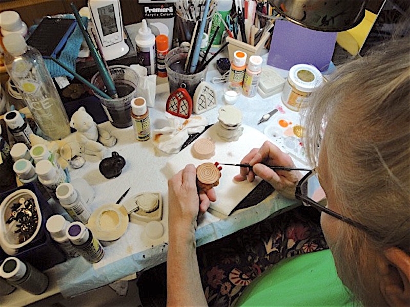 She does commission work as well, such as creating an animal in remembrance of a beloved pet that died. While she likes dogs, she loves cats, and painting them is one of the tasks she most likes.