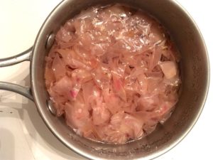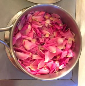 To preserve some of it just a little longer, I gathered a pan of petals, added just enough distilled water to almost cover, and then I put the lid on the pan and let it slowly simmer, never letting it boil, for about an hour. When all the color has left the petals, the water will be tinted the color of the roses and it’s done.