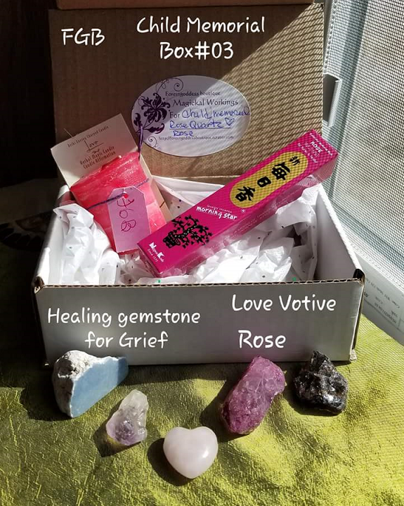 Finally I wanted to share a few boxes from my boutique, these boxes are a Memorial for your Dearly Departed Love Ones and Pet/Familiar. We provide Spirit Votives, 4 Gemstones for Crystal Healing – Grieving, and 1 twin soul crystal point, and ideas to celebrate their life in remembrance. We will be adding more items for  Samhain Inspired Memorial Gifts. Blessings of love and light – Norma