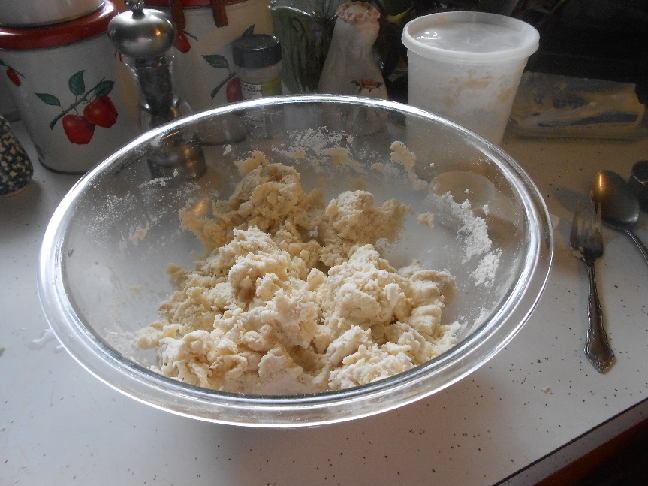 Put the pieces of butter into the bowl with the flour-salt mixture and, using a pastry cutter or a fork, cut the butter into the flour until the mixture looks like small peas. This takes a while and some might complain that it’s tedious work but my attitude is that it’s meditative and spiritual. Working with any kind of dough makes me think of the various grain goddesses and how vital breadstuffs were to the people who worshiped them – so much so that Isis, for instance, was called “The Lady of Bread”. Bread was life.
