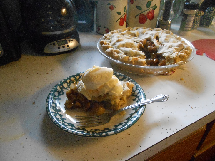 The oven is always preheated to 425 degrees. I always put a pizza pan on the rack below the pie, in case the pie drips over during the baking process. This has saved me a lot of cleaning hassle in the past. I leave the pie in the 425 degree oven for five minutes, then turn the oven down to 350 degrees for the rest of the cooking period. It will take about an hour to bake, depending on your oven and the amount of apples you put into your pie and how dense they were. You’ll know when the pie is done. The crust will be golden brown and the apples will be glistening inside the slits you made. And the aroma! There is no mistaking that heavenly smell!