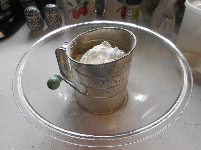 The next thing I do is measure the flour and salt into my sifter and sift it into my bowl. For a two-crust pie, I use two and a half cups of flour and one-half teaspoon of salt.