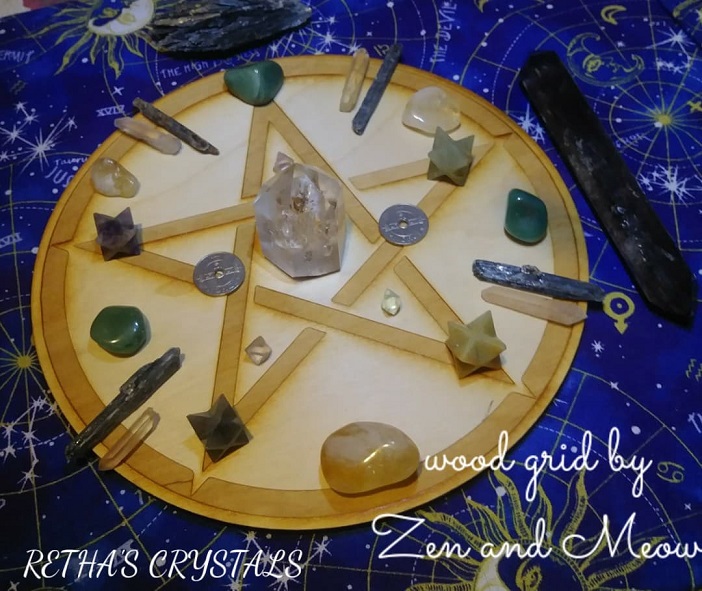 Kelly Matthews from Zen and Meow was so kind to send me one of her lovely wood grids made of birch in a pentacle design. It was the twelve inch size and I really enjoy the larger size grids. Lots of room to fit crystals! In her etsy shop there are tons of options for designs and all come in four sizes, 3 in, 6 in, 9 in, and 12 in. ranging in price from $7 to $33. Its great that you can personalize both the design and the size to your liking. The wood is simply top notch quality and the engraving of the design looks stunning.
