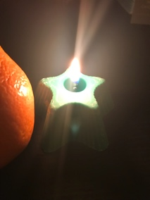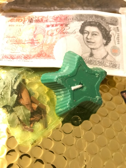 I carefully undo the paper bag and am surprised by how much is packed into the small package. There’s a gorgeous, green star-shaped candle, a bag of woody herbs, a napkin with £50 notes printed on it and clear instructions for a money spell.
