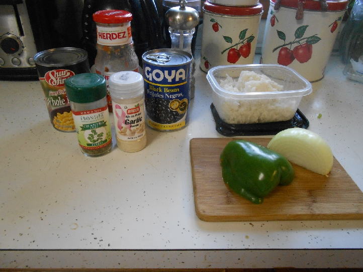 But for this recipe, you are going to want a can of black beans. I used day-old leftover rice but if you make it fresh, you will need a cup and a half. You will also need a half a can of corn, a medium-sized green pepper, a small onion or half a medium-sized one, some chunky salsa, and about two tablespoons of olive oil. And your seasonings: dried cilantro, dried parsley, garlic powder, salt and freshly ground pepper to taste.