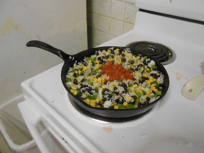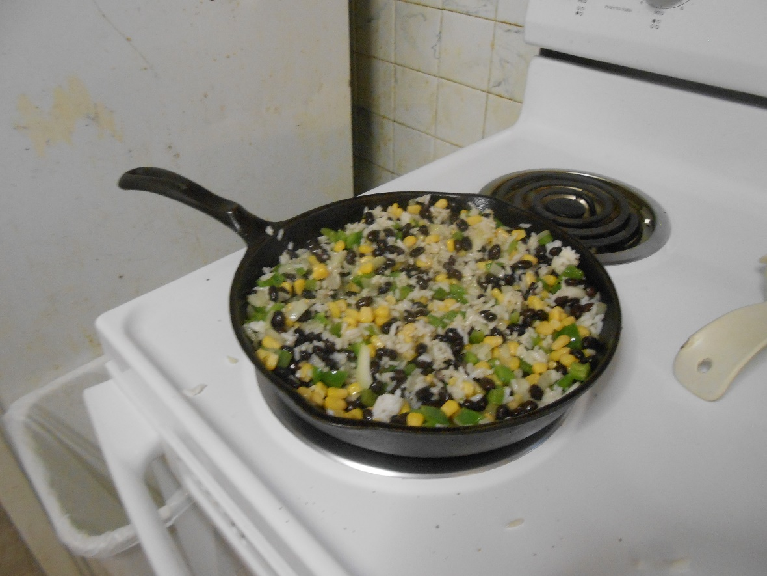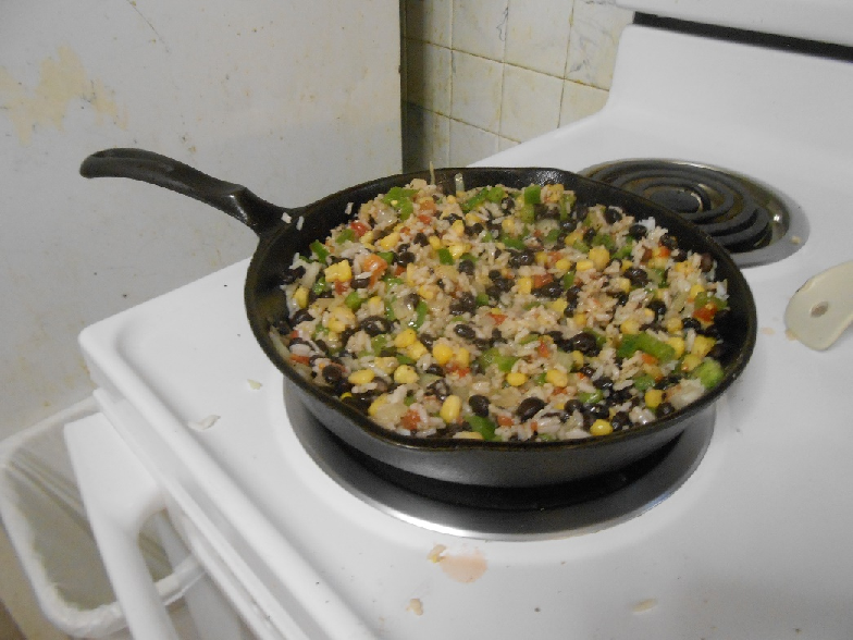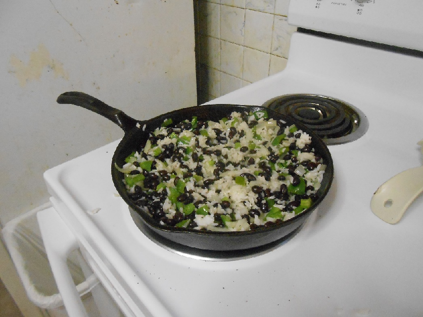 After making sure there’s no moisture left on the beans, add them to the rice and peppers and onions mixture, mixing well.