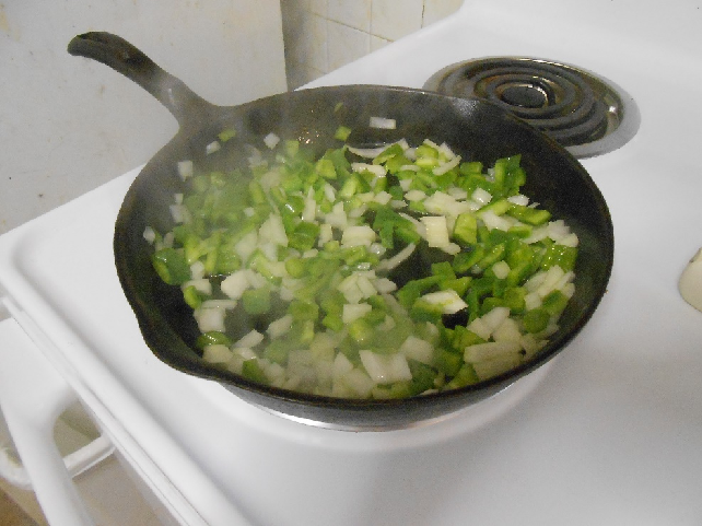 Put the olive oil in your pan and heat for sautéing and then add the peppers and onions. Give them a good stir and let sauté in the hot oil for about two minutes.
