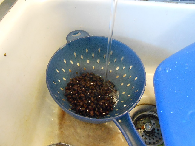 The next thing you want to do is add the black beans, but before you do that, you need to drain them and rinse them or else the liquid in the can will stain the entire dish. This is the only time I strain black beans.