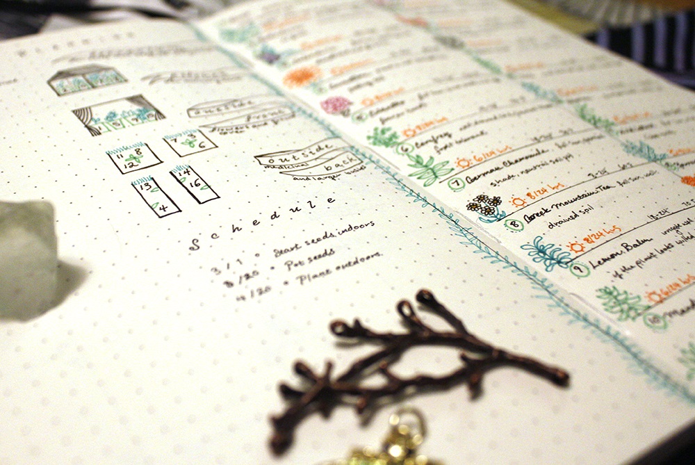 The final step in this process is to carry the theme forward through the rest of my journal so that I can return to this intention on an appropriate schedule and don’t forget what I’m doing or get lost in my plans. With most of these plants, weekly observation should be sufficient for me to determine their needs, but there is still quite a bit of work to be done to get everything set up, and I’ll need to be very careful when I’m starting my seeds. I can’t wait to see what grows!