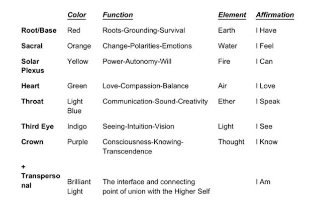 There are seven major chakras that are the usual staple of reading and energetic practice, however, there are hundreds of minor chakras. Each chakra has a specific color, elemental and function associated with its energy. See the charts and figure below for the basic information relating to the seven major and Transpersonal chakras: