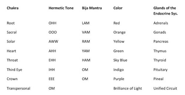 Additionally, each of the seven chakras have a specific tonal quality. The chart below lists the Hermetic tone and the Eastern Bija mantras that are associated with each chakra.