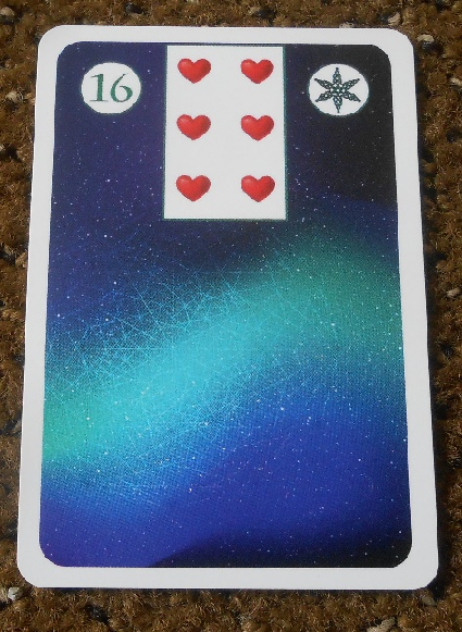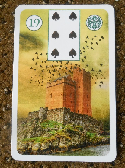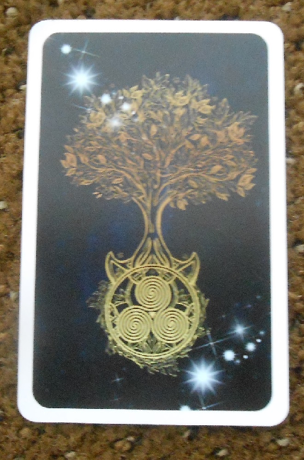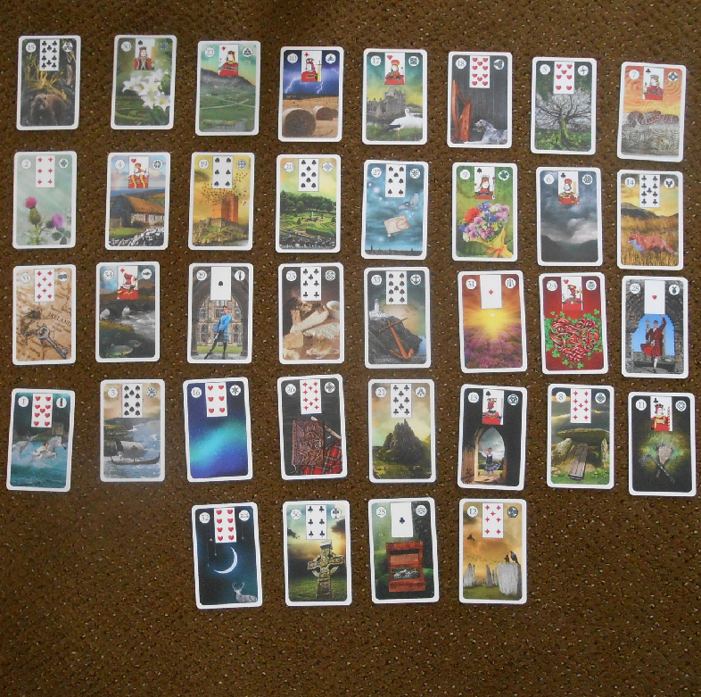 As soon as I get any new deck of cards – be they Tarot, Oracle, Lenormand, or just a new set of playing cards – I shuffle through them to get a good feel of the deck. The Gaelic Lenormand is just a bit smaller than a standard poker deck and is constructed of durable card stock, glossy and easy to handle. The back shows a Celtic tree of life growing out of a badge with triple spirals in a black sky of stars – the body of the tree looks like a person reaching up to the heavens in praise! Or in dance! The picture itself is alive with meaning and could be used in mediation itself.