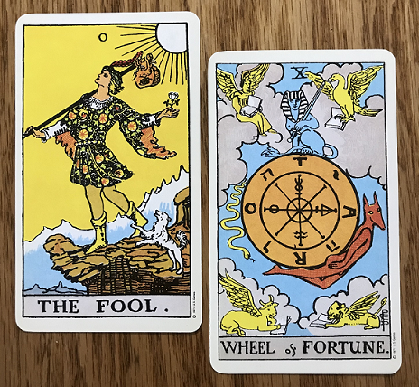 Both The Fool and The Wheel tell of a major reboot. Both cards warn us that circumstances are likely to force an unexpected change in direction, so we need to learn from our mistakes or we will end up repeating them. Both cards tell of a crossroad, or of a decision that must be made before going forward. Both cards bring a bit of chaos, The Fool by trusting that the Universe will protect him as he risks all, and The Wheel by combining the opposites of Victory and Mercy to bring about sweeping changes in the current situation.
