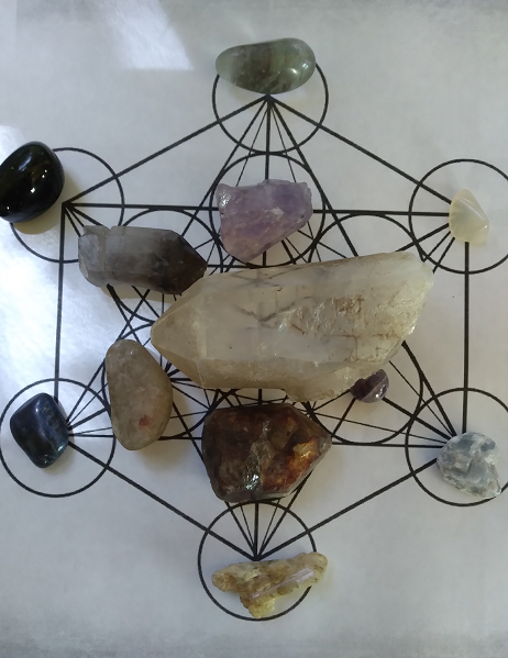 Metatron’s cube is a crystal grid from sacred geometry and will be our example crystal grid for this explanation. Sacred geometry can be an overwhelming venture, so we will only cover here what is needed to understand the metatron’s cube. It represents healing, spiritual connection, and the creation of everything as it is said to possess every shape found in the building blocks of the universe. Its creation and history stem from mythology so we won’t dive too far into that here, but it is connected to the archangel metatron who is said to be the voice of god, and my favorite character in Dogma. There are multiple configurations in which you can use this grid, meaning you can have the energy flow in different directions. For example you can have the energy enter the grid from the top and exit through the bottom into yourself. It can go from you, into the bottom crystal, and out of the top. The energy can enter from every outside crystals and exit the center crystal or vice versa. For this example we’ll have the energy enter the center crystal and charge the outer crystals, treating it like a power grid.
