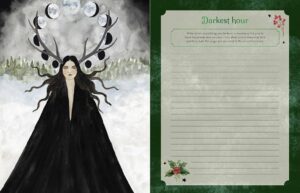 I chose to review this journal because the winter, and Yule/Christmas is my least favorite time of year, and this year, having suffered some significant losses, is likely to be harder than normal. After looking through this journal and the prompts within, I felt a comforting peace, knowing that when the time is right, I will put pen to paper and allow my own inner wisdom to shine bright in the darkest of nights in each one of these prompts. The illustrations and overall design of the journal are eye appealing, without overdoing it. The imagery invokes a mystical, slightly ethereal, yet warm and cozy, winter vibe. Perfect for the witch in your life (or yourself)! I’m dropping a few photos to illustrate (no pun intended) the beauty and allure of this enchanting journal, but I really suggest you get one for yourself if you’re interested. It becomes its own Yuletide grimoire over time, filled with your own magic.